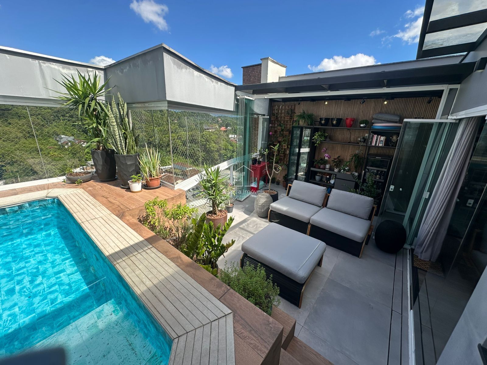 No pavimento superior você encontra uma piscina privativa ideal para momentos de relaxamento e recepções. A área social é integrada — sala de estar, sala de jantar e cozinha — formando um ambiente amplo e acolhedor; há ainda lavabo e uma lavanderia completa e bem equipada.